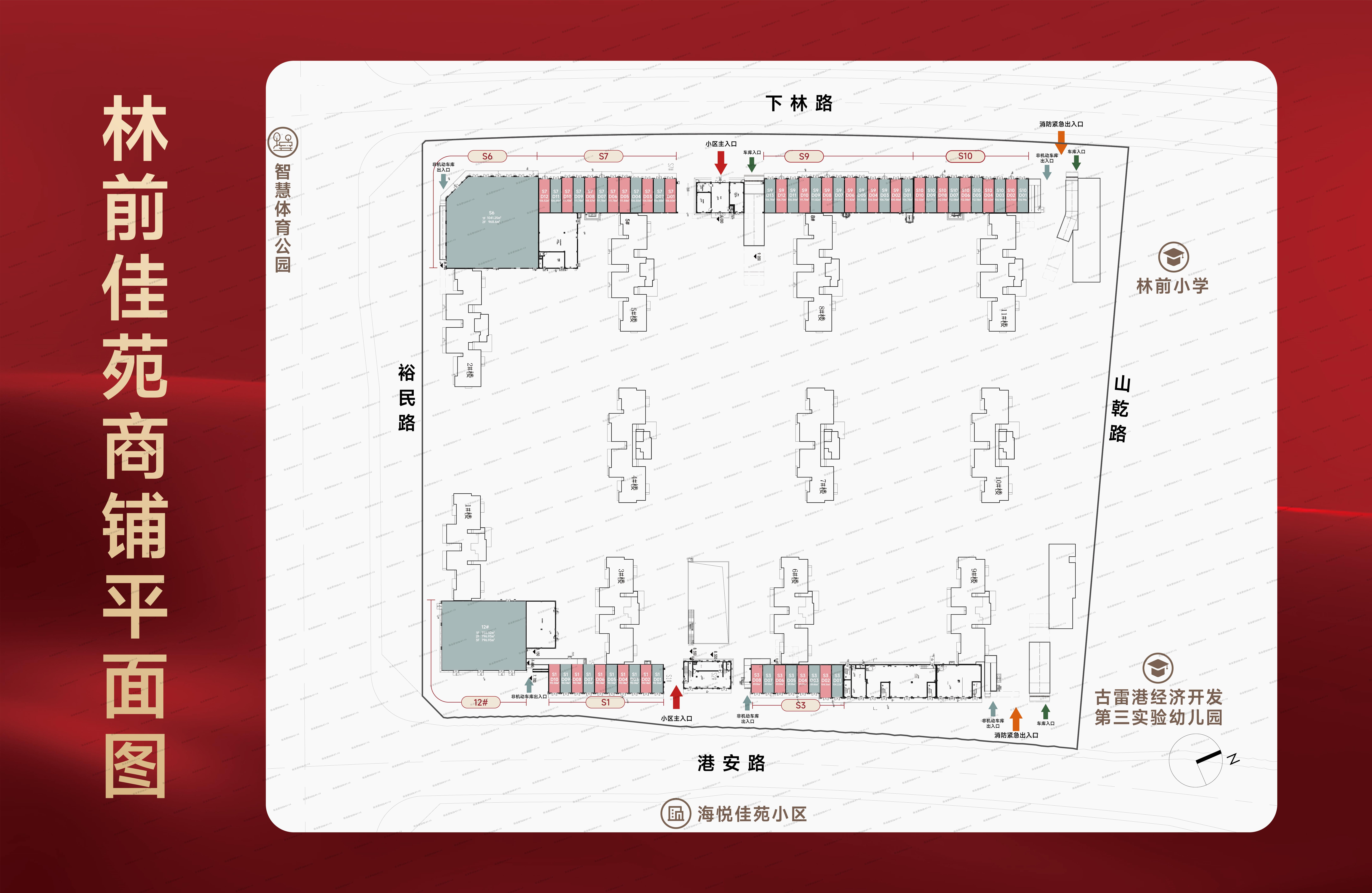 林前佳苑为安商一体化项目,产权为漳州九龙江古雷置业有限公司所有,位于古雷新港城世纪金源九区项目北侧,其中商铺共计58间,合计面积约0.98万㎡(数据来源于福建金地勘测规划有限公司实测报告),现已完成封顶,土建部分已完工,暂未竣工验收,产权证尚未办理。商铺多为两层结构,单层层高约4.5m,门面宽约4.2m,单套面积约80-100㎡,不同单元、不同楼层局部可能不同。附租赁商铺清单如下: